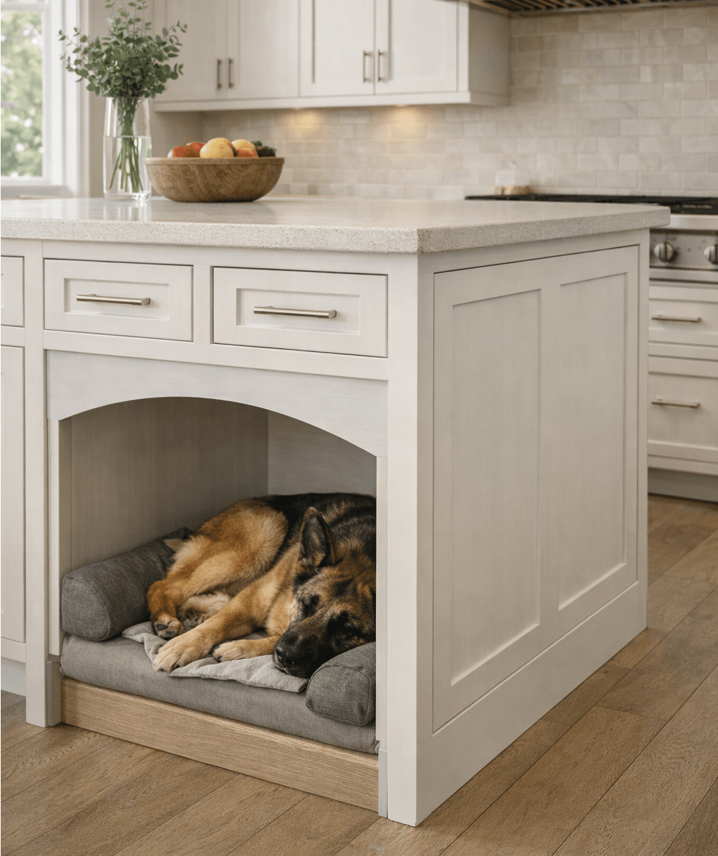 Custom millwork allows for elegant built-in pet beds beneath cabinetry or within kitchen islands. For homeowners who require enclosed spaces, discreet kennels can be integrated with ventilated doors that complement surrounding cabinetry.